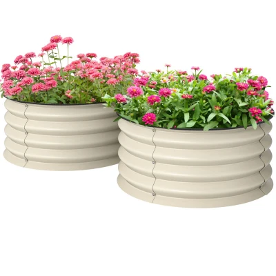The raw, unpolished design of these two Outsunny planters makes them a must for outdoor spaces. Easy to blend in with natural surroundings, they are ideal for every garden. Made from galvanised steel, each piece is tough the open bottom design means there's direct contact with soil for maximum growth. Complete with rubber-sealed top to pick up and carry safely. Comes in a set of two for double the growing power. Specifications: ● Colour: Cream White ● Material: Galvanised Steel ● Overall Dimensions: Φ60 x 30Hcm ● Interior Dimensions: Φ58 x 30Hcm ● Single Curved Panels: 51W x 30Hcm ● Item Label: 845-972V00CW Features: ● Set of two raised planters for garden: use together or alone ● Open bottom for direct contact with soil. No water build-up in bottom ● Galvanised steel frames mean strong, sturdy structures ● Rubber-sealed tops: pick up and carry safely ● Rugged design: raised beds for garden look great in outdoor surroundings ● Easy to assemble