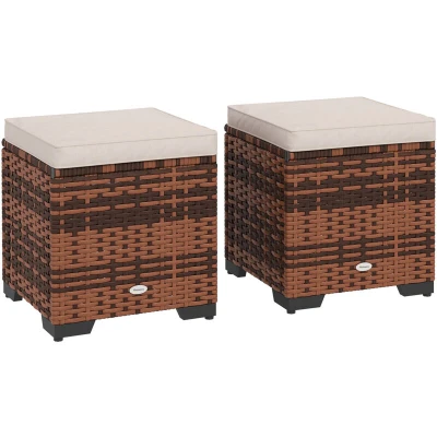 Outsunny Set of 2 Rattan Storage Ottoman, Outdoor Footstool with Removable Cushions, Garden Seat for Balcony, Poolside, Living Room, Beige