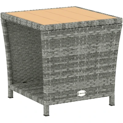ManoManoYour serene outdoor moment deserves more than a cluttered floor for your essentials. That constant reaching and worrying about spills can spoil the tranquility of your patio or balcony. The Outsunny outdoor coffee table elegantly solves this. Its two-tier design keeps drinks and books handy yet in order. Rattan side table, built with a solid, UV-resistant frame, brings lasting style and convenience to your relaxing spot. Specifications: ● Colour: Light Grey, Natural Colour, Dark Grey ● Materials: PE Rattan, Galvanised Metal, PS ● Overall Dimensions: 45W x 45D x 43H cm ● Weight Capacity: 50 kg ● Item Label: 867-334V01ND Features: ● Features two tiers of open storage, keeping your books and drinks tidy ● A powder-coated frame and PE wicker make this outdoor coffee table strong ● The PS wood-plastic tabletop is both wear-resistant and very easy to clean ● Supports up to 50 kg making it suitable for plants or heavy items ● This stylish 45W x 45D x 43H cm balcony table complements any