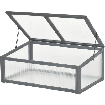 General description This wooden cold frame from Outsunny is an excellent choice for nurturing your plants. Designed as a lean-to greenhouse, it provides a reliable shelter for your plants. The transparent polycarbonate panels ensure maximum light transmission while retaining heat, making it ideal for protecting plants late in the season. This wooden greenhouse creates an environment with optimal temperature, allowing your plants to enjoy sunlight and grow healthily. Technical specifications Color: Grey Material: Fir Wood, PC Board Overall Dimension: 100L x 65W x 40H cm Height of Front Eaves: 32 cm Internal Planting Area: 96L x 59.5W cm Height of Internal Front Eaves: 30 cm Height of Internal Rear Eaves: 38 cm Top Cover Opening Spacing: 50 cm Installation Assembly required. Usage Provides a warm environment for plants, extending the growing season. Openable cover allows for good ventilation and easy plant care. Top slope design prevents rainwater accumulation.