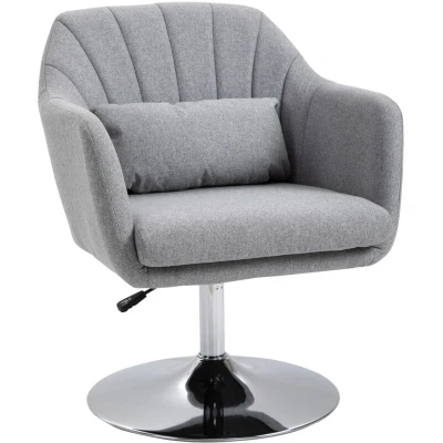 General description Make those all-important relaxation times at home better than ever before, thanks to this on-trend swivel lounge chair from HOMCOM. The seat features a retro tub design, providing ample room to sit, with supportive back and armrests for added comfort. Filled with sponge for comfort, the chair is wrapped in linen-feel fabric for a smooth touch and easy maintenance, and comes with a seat cushion and small back cushion for extra support. Technical specifications Colour: Light Grey Materials: Linen (100% Polyester), Sponge, Steel Dimensions: 79-91H x 60W x 60D cm Seat dimensions: 45-57H x 47W x 46D cm Back dimensions: 35.5H x 46W cm Weight capacity: 136 kg Item Label: 833-757V72LG Features Retro and timeless design adds style to your home 45-57 cm adjustable height for personalized comfort 360° seat movement for easy mobility Filled with sponge for enhanced comfort Strong steel frame for durability Large round base for stability Seat cushion and small back pillow