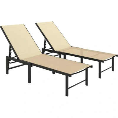 Outsunny Sun Loungers for Garden Set of 2, 5 Level Adjustable Reclining Lounger Chairs, Flat Sunbed with Texteline Seat, Steel Frame Patio, Beach, Khaki