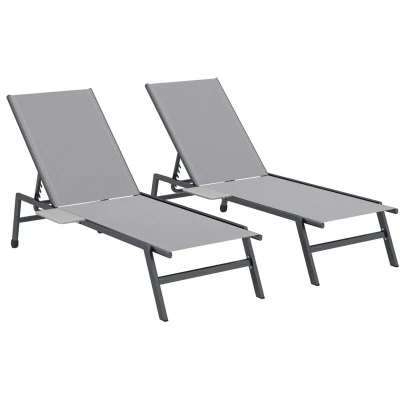 Picture a serene afternoon by the water, but the moment is spoiled by mismatched furniture and nowhere to place your drink. This Outsunny sun loungers for garden ends the frustration. It includes two coordinated loungers ensuring a harmonious look. Each chair features five backrest positions for personalized comfort and an integrated side tray table. Unwind completely with everything you need right at your fingertips with this sun lounger set. Specifications: ● Colour: Charcoal Grey Frame, Grey Fabric ● Material: Metal, Breathable Mesh Fabric ● Overall Dimension: 190D x 74W x 35H cm ● Fully Recline Size: 190D x 60W x 35H cm ● Side Tray Table Size: 30L x 15W cm ● Seat Size: 56W x 110D cm ● Seat Height: 33 cm ● Back Size: 56W x 78H cm ● Back Height to Floor: 90 cm, 80 cm, 69 cm, 56 cm, 33 cm ● Weight Capacity: 120 kg (Lounger), 10 kg (Table) ● Item Label: 84G-974V00GY Features: ● This complete sun beds for garden for two is designed for outdoor relaxation ● Find your preferred comfort