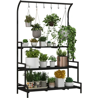 Outsunny Tall Plant Stand with Hanging Hooks, 3 Tiered Rack Ladder Shelf for Indoor Outdoor Porch Balcony Living Room Bedroom, Black