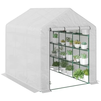 ManoManoGeneral description Green growing outdoors, all year round with this Outsunny 8 x 6 ft walk-in greenhouse. This spacious garden greenhouse houses plenty of plants and comes with 12 shelves to easily organize pots and more. It features a powder-coated steel frame for a strong core, fitted with a plastic cover to protect the interior from the weather, and is finished with a roll-up door for easy access. Technical specifications Colour: White, Dark Green Material: Steel frame, PE cover Overall Dimension: 244L x 180W x 210H cm Shelf Height: 48 cm Weight Capacity: 10 kg (each shelf) Windproof: Level 4 (wind speed below 28 km/h) PE Cover: 140 g/m² Item Label: 845-696V01WT Installation Assembly required Includes 4 ground stakes and 4 guy ropes to secure the greenhouse to the ground Usage Not suitable for bad weather conditions Open inner space allows for customizable setup 3-tier shelf on each side for plant display and storage