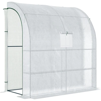 General description This Outsunny walk-in garden greenhouse is ideal for home gardening, providing essential protection for your plants to thrive. It features a sturdy frame and a PE cover that safeguards your plants and vegetables from various weather conditions. The greenhouse is designed to be placed against a wall, making it a convenient addition to your home, garage, barn, or shed. Technical specifications Overall Dimensions: 200L x 100W x 213H cm Window Size: 35W x 35H cm Door Size: 70W x 200H cm Wire Panel Size: 87L x 28.5W cm Material: PE cover, Steel frame Colour: White with Green frame Usage Extends your growing season and protects plants Provides ample space for plants with a 3-tier design and 4 wire panels Windows with netting allow for ventilation Accessible doors on both sides with 2 zippered roll-up doors that can be secured open Other information Assembly required Note: Not suitable for bad weather conditions