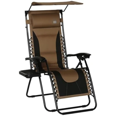 General description Let the day's stress drift away with this zero-gravity chair from Outsunny. Its comfortable design evenly distributes your body weight to reduce back pressure and provides superior lumbar support as you sit. This piece of outdoor furniture allows you to relax while fully reclined to the most comfortable 'zero-gravity' position. Technical specifications Colour: Brown Material: Steel Frame, Oxford, PP, Sponge Overall Dimension: 89D x 65W x 113H cm (upright) Folding Dimension: 96L x 65W x 14H cm Seat Size: 52W x 51D cm Seat Height: 48 cm (front), 37 cm (back) Armrest Height: 63 cm Back Size: 52W x 78H cm Headrest Dimension: 37L x 18W x 5H cm Tray Size: 30L x 20W cm Max Load: 120 kg Usage A stress-free weightless feel for relaxation Lockable reclining system, can be adjusted to any position you want Removable headrest cushion for added comfort Canopy to create shade over your head, keeping you cool as you recline Tray with cup holder to keep drinks within easy reach