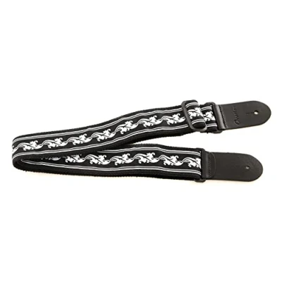 Ovation guitar straps, nylon signature "leaf", black Ovation nylon strap, 50mm/2" wide, lined throughout Leather ends 3mm/.12" thick with embossed Ovation logo Adjustable from 84cm/33" – 144cm/56.7", Embroidered Ovation "Leaf" motif from the Round-Soundhole models The woven leaf design features the oakleaves that have formed the Ovation soundhole rosettes since the early years.
