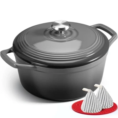 Overmont 5L Enamelled Cast Iron Round Casserole Pot With Lid Cookbook & Cotton Potholders Non stick Dutch Oven Cookware for Braising, Stews, Roasting, Bread Baking Grey, 26cm