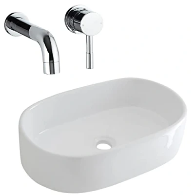 Overton Modern 480mm x 350mm White Ceramic Oval Countertop Bathroom Basin Sink With Wall Mounted Tap Milano