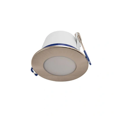 Fire rated LED Downlight in a Satin Chrome finish from Ovia Lighting. The fully integrated LED light source produces a light output of 350 lumens. With a beam angle of 90 degrees its dimmable as standard and has a 2700K extra warm white colour temperature.