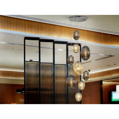 Lamp of 9 lights, made of metal, chrome finish. Combined glass shades: small and large size. Two shimmered glass colours: Cognac and Smoked grey. Adjustable length. DIMMABLE. Remote control included.