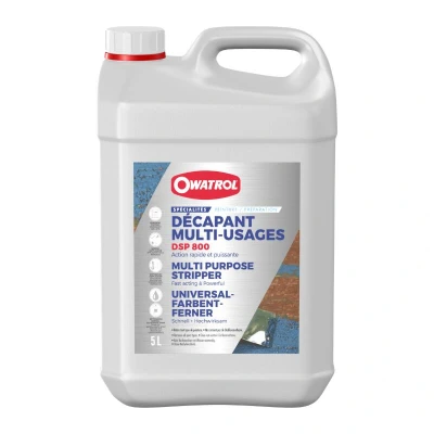 General description Owatrol DSP 800 is a powerful, dichloromethane-free multi-purpose paint stripper designed for the removal of various coating types, including alkyd, acrylic, polyurethane, epoxy, cellulose, and more. It effectively removes 2-pack paints and powder coatings without damaging the substrate, making it suitable for a wide range of applications. Fast-acting and ready to use, DSP 800 works on all surfaces (except plastic) and leaves a clean, coating-free surface that can be refinished after just 6 hours. It contains no acid, caustic soda, or potash, ensuring that it will not darken wood and requires no neutralization after use. Technical specifications Volume: 5 Litres Active ingredients: Paraffin-based Application time: Varies by coating type (see usage section for details) Usage Ideal for removing car paint, stripping interior and exterior wood surfaces, getting rid of unwanted carpet glue, and stripping paint from stone and cement walls. For optimal results, apply a