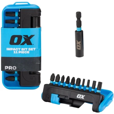 OX Tools Pro Impact Bit Set 11 Piece OX-P215311 This 11-piece set provides essential bit sizes and features a specialized Philips bit for added convenience. Perfect for DIYers and professional contractors, this bit set is designed to be durable and complete tough jobs. Impact rated for use with impact drivers. Contents: PH.1 (Qty 2) PZ.1 (Qty 1) PZ.2 (Qty 2) T-10 (Qty 1) T-15 (Qty 1) T-25 (Qty 1) T-30 (Qty 1) PZ.3 (Qty 1) 1x Magnetic Bit Holder 11 Piece set: Includes Impact bits 25mm x 10 and Impact magnetic bit holder 60mm x 1. Durable Material: Consists of 8 impact material bits with a black phosphate finish, ensuring durability. Impact Magnetic Bit Holder: Equipped with a magnetic bit holder designed for impact use, ensuring secure bit retention. Hex Shank: Features a hexagonal shank design for compatibility with various tools and easy bit changes.