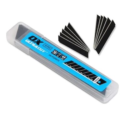 10 Pack Premium SK5 Blackened Steel - Engineered from hardened SK5 steel with a durable blackened finish, these blades offer long-lasting sharpness and strength for demanding cutting applications on the jobsite. 8 Sharp Snap-Off Segments - Each blade features 8 precision-ground snap-off segments, so you always have a fresh, ultra-sharp edge for clean, controlled, and accurate cuts with less downtime. Extreme Break Resistance: Tempered and hardened to resist bending and breaking, these 18mm box cutter blades are built for strength and safety in heavy-duty trade and construction environments. Compatibility: Fits all OX 18mm snap-off utility knives and most standard snap-off box cutters, giving you flexibility across your cutting tools without compromising on fit or performance. Safe Blade Dispenser Included: Comes in a compact safety dispenser for secure storage and quick access, keeping your blades protected, organized, and ready when you need them., Weight: 0.16 pounds, Manufacturer: OX Tools