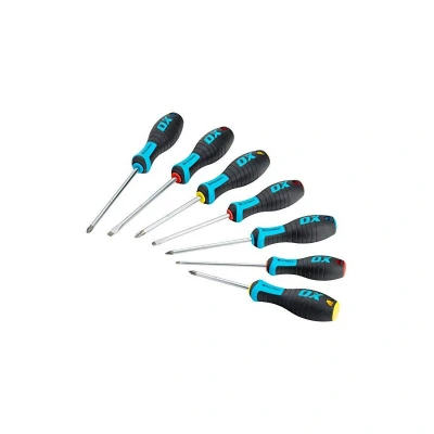 General description The OX Pro 7 Piece Screwdriver Set includes a variety of screwdriver sizes, featuring Phillips, flat head, and Pozi drive options. Each screwdriver is crafted from chrome vanadium steel, ensuring durability and strength. The soft grip handles are molded directly to the shaft, providing maximum strength and comfort during use. The color-coded handles make it easy to select the right screwdriver for any task. Technical specifications Material: Chrome vanadium steel Handle type: Soft grip, molded directly to the shaft Sizes included: Flared 6.5 x 150mm, Parallel 3.5 x 75mm, Parallel 5.5 x 125mm, Phillips PH1 x 100mm, Phillips PH2 x 125mm, Pozi PZ1 x 100mm, Pozi PZ2 x 125mm Other information Supplied in a cardboard display case.