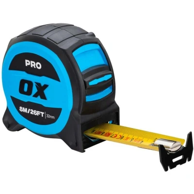General description The OX Pro 8m/26ft Tuff Blade Tape Measure is designed for durability and precision, making it ideal for professionals who require reliability and accuracy in their measurements. Technical specifications Length: 8m (26ft) Blade width: 32mm Standout: 4m Reach: 5m Nylon coating thickness: 0.02mm Other information Heavy-duty nylon-coated blade for increased rigidity Strong ABS plastic housing for protection against job site rigors Dual magnet wide hook for easy measurements on metal surfaces Rubber over-mold for shock resistance and comfortable grip