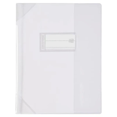 Flexible and translucent notebook cover. Made of PVC, thickness 15/100 Adhesive corners reinforced in PVC, thickness 30/100. Label holder + lined paper label Compatible with school size notebooks 17 x 22 cm Phthalate and heavy metal free PVC Made in France