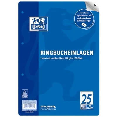 Oxford 400131468 Ring Binder Inserts A4 50 Sheets Line Style 25 Lined with White Border 90 g/m² Paper SCRIBZEE Compatible