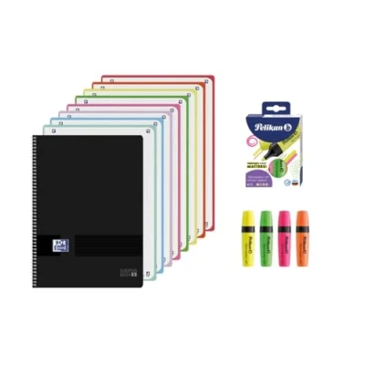 Oxford, A4 Notebook, 8 Coloured Bands, 160 Microperforated Sheets, 5 x Black Plastic Cover, Includes 4 Pelikan Neon Highlighters