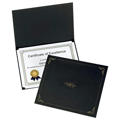DURABLE: Each certificate holder is made of 30% recycled fiber and 30% post consumer fiber to secure and transport letter-sized certificates STYLISH: These certificate holders have gold-foil embossed covers with a linen finish ARCHIVE: These certificate holders are great for archiving certificates in hanging files VERTICAL OR HORIZONTAL: Display your certificates in vertical or horizontal orientation FEATURES: 25 Black, Letter Size Oxford Certificate Holders with a linen finish