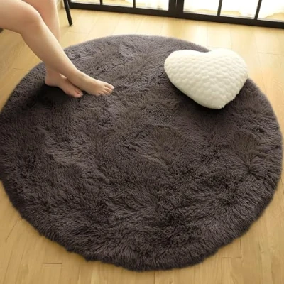 Oxford Homeware Round Rugs Living Room 120x120 cm Fluffy Shaggy Brown Area for Bedroom, Lounge Modern Super Soft Non Slip Rug Washable Floor Carpets Bedside Kid