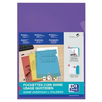 TRANSPARENCY: The translucent polypropylene of the corner pocket allows immediate identification of the contents and better readability of documents CAPACITY: The Shine clear corner pocket has good storage capacity as it can hold 25 A4 sheets, on average OPENING: For easy opening, a thumb cut is located on the translucent pocket. It allows easy access to the contents and offers a quick opening of the corner pocket Resistance: To offer better resistance to the corner pouch, the bottom seam is reinforced for optimal strength and to allow frequent and prolonged use of the translucent pouch Finish: thanks to its good thickness (12/100th) polypropylene, the transparent Shine corner pouch offers an aesthetic and quality finish