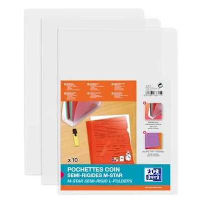Transparent: The translucent PVC of the corner pocket allows immediate identification of the contents and better readability of documents CAPACITY: M Star clear corner pocket has good storage capacity as it can hold 25 A4 sheets on average Opening: For easy opening, a cut-out is located on the translucent pouch. It allows easy access to contents and offers a quick opening of the corner pocket Finish: thanks to its anti-ink transfer PVC and good thickness (15/100th), the M Star transparent corner pouch offers a quality finish, without the risk of ink staining the sleeve. The PVC used for its design is rigid, which allows a firm vertical hold of the sleeve in a magazine rack or other items Colour: the M Star corner pouch is available in translucent colourless, for immediate recognition of contents and simple filing