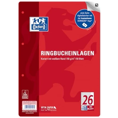 Our ring binder inserts are the classic among paper products 50 sheets or 100 writable pages with 25 ruling - squared with white margin High writing comfort thanks to the oath-smooth, bright white optic paper - no bleeding and shining through the ink With 4 holes for filing the sheets in folders, staplers and ring binders With the help of the four corner markings on the paper, the notes can be scanned, stored and organised faithfully with the free app SCRIBZEE
