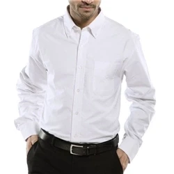 Euroffice70% cotton/30% polyester. Easy care fabric. Semi-fitted styling. Button down collar. Left breast mitred pocket. Button fastened cuffs that also fit cufflinks. Back yoke with two side pleats. Curved hem.