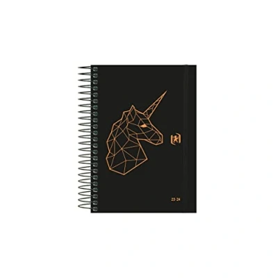 Agenda for the entire school year, from September 2023 to August 2024. 8° format with measurements: 12x18 cm. 304 pages Interior: Day page in Spanish with header and date well visible. Large space for notes and QuickNotes space to prioritize the essentials. Week planning advance to highlight what's to come. Monthly calendar Matte film extradura caps and rose gold stamping on a very elegant black background. Black spiral and micro-perforated handle for easy access to the current day Sticker sheets to customize the agenda and closure with matching rubber Compatible with the SCRIBZEE app where you can scan your notes with the app and you can check your agenda from anywhere.