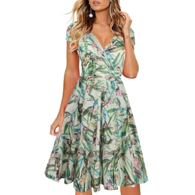 Oxiuly Women's V Neck Cap Sleeve Floral Casual Work Stretchy Swing Dress OX233 Green