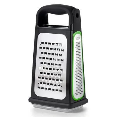 The OXO Good Grips Etched Box Grater with Removable Zester has a comfortable, soft grip handle which provides a secure and slip-free grip. Its durable and sharp etched surfaces provide an easy way to grate ingredients whilst the non-slip foot keeps it firmly in place during use.The four-sided design of this OXO box grater features a medium grating blade and a coarse grating blade as well as an angled slicing blade. The fourth side has a removable zester blade which can be used on the grater or used independently over a cutting board or bowl.The OXO Good Grips Etched Box Grater also includes a removable clear container with measurement markings allowing you to catch and measure food in one go. A lid is also included for storage and when not in use the container can be stored inside the box grater.Top rack dishwasher safe for easy cleaning.