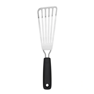 This stainless steel spatula with slots from OXO Good Grips is perfect for preparing fish. The slim blade slides easily under the fish, then turns or serves it. The long, shapely slots allow excess fat to drain easily. This spatula features a soft, comfortable non-slip handle and a hanging eye. After use, it may be placed in the dishwasher.