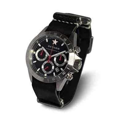Stainless steel round case Water resistance to 100 meters Hardend mineral glass "nato-style" interchangeable leather strap with no tools required to change strap Chronograph stop watch