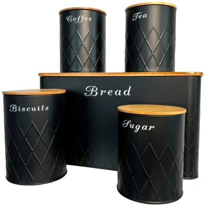 Oypla 5pc Black Bamboo Lid Kitchen Canister Storage Tin Set Bread Biscuits Tea Sugar Coffee