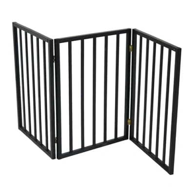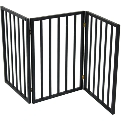 Black Dog Safety Folding Wooden Pet Gate Portable Indoor Barrier Keep your dog from treading muddy footprints throughout your house with the folding pet gate. The pet gate folds to create an instant barrier to and from any room without the need to install permanently to a door frame. The barrier has 3 hinged sections each measuring 45 x 61cm and is manufactured from high quality natural pine wood. Product Specifications: Panel Dimensions: 45 x 61cm Panel Thickness: 1.9cm Fully Extended Dimensions: 135 x 61cm