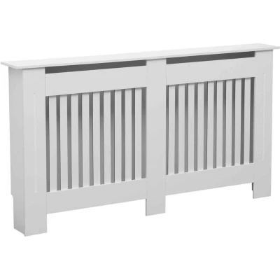General description The Oypla Large White Wooden Slatted Grill Radiator Cover is an elegant solution for concealing unsightly radiators while enhancing the style of your home. Crafted from high-quality MDF with a sleek white finish, it seamlessly blends into your room's decor and provides a convenient shelf for additional storage. Technical specifications Material: High-quality MDF Color: White Dimensions: 152(L) x 19(W) x 82(H) cm Installation Includes fittings for securely mounting to a wall. Usage Improves air circulation to dissipate heat throughout the room. Helps prevent children from burning their fingers on the radiator.
