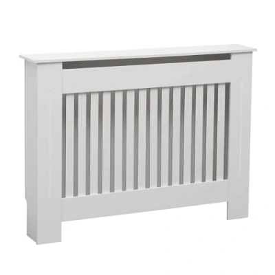 General description The Oypla Medium White Wooden Slatted Grill Radiator Cover is an elegant solution for concealing unsightly radiators while enhancing the style of your home. Crafted from high-quality MDF with a sleek white finish, it seamlessly blends into your room's decor and provides a convenient shelf for additional storage. Technical specifications Material: High-quality MDF Finish: White Dimensions: 111(L) x 19(W) x 82(H) cm Installation Includes fittings for securely mounting to a wall. Usage Improves air circulation to dissipate heat throughout the room. Helps prevent children from burning their fingers on the radiator.