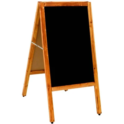 Wooden Chalkboard Blackboard Pavement Display Sign A-Board The chalkboard is made from high quality waterproof varnished pine wood making it ideal for both indoor and outdoor advertising. The chalkboard is double facing with specialised blackboard panels ideal for use with liquid or traditional chalk. The chalkboard features brass hinges as well as two locking stays to keep it secure in poisiton. The chalkboard also features foot protectors to keep it stable as well as preventing damage to the frame on hard surfaces. Product Details: Dimensions: 80 x 40cm Weight: 3kg