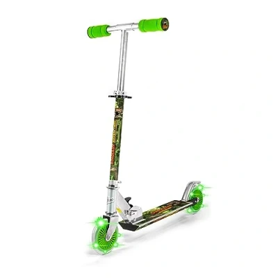 Two-wheeled scooter with a light up wheels and a dinosaur design Adjustable height Light up wheels come on automatically when ridden