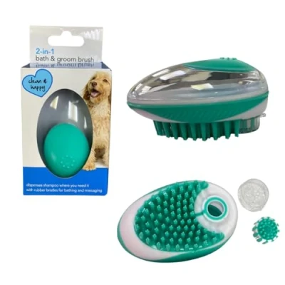 2 in 1- Pet Bath & Groom Brush with Shampoo dispenser. A simple solution which dispenses shampoo onto your pets where needed with just a press of a button. Clean & Happy Bath and Groom Brush is ideal for cleaning, bathing, massage, and provide a stressfree experience for pets. EASY TO USE - Just open the cap on the top so that you can pour the shampoo into the valve and close. Press the rubber button on the top to dispense the shampoo where needed and lather the soap and brush in circular motions to clean and massage into the fur and skin. CLEANS & MASSAGES - Soft but firm bristles make sure you can effectivey clean and massage your pet at the same time in the bath or shower. GROOMING BRUSH - Also suitable as a dry grooming brush to tidy, comb and remove unwanted pet hair. ANTI- SLIP - The edge grip means you can use it confortably in your hand wihtout it slipping.