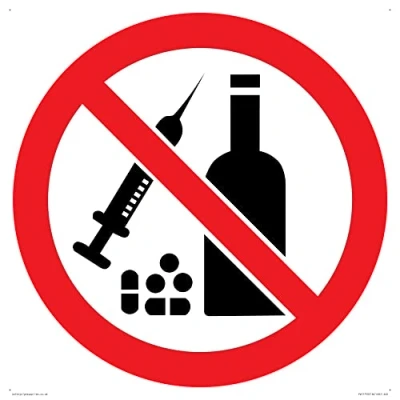 P908 : No alcohol or drugs This sign is made from plastic semi rigid 1mm self adhesive Comes with4mm Corner Holes. S40 square Sign Text: