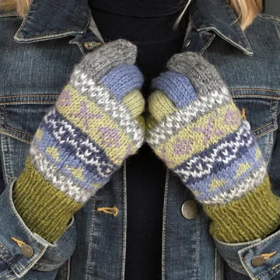 The Pachamama Classic Fairisle Gloves in Olive are made from a wool blend with ribbed cuffs and covered fingers to keep you warm in the cold weather. They have a unique fairisle design in shades of olive, purple, grey and white.With a thick hand knitted outer layer, these gloves have been crafted with care for added comfort and warmth.Matching accessories available.100% WoolMachine wool wash or cool handwash.PLEASE NOTE colours and patterns may vary slightly due to their hand made nature.