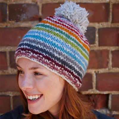 Thermal Insulation: 100% wool with fleece-lined headband for warmth and comfort in cold weather Versatile and Functional: One-size unique and loveable women's design for Winter walks and outdoor activities Handmade Quality: Woollen bobble beanie hat handcrafted from pure sheep wool using traditional knitting methods Eco-Friendly: Pachamama hats are a Fairtrade ethical choice, supporting sustainable livelihoods for artisan communities Distinctive Style: With a multicoloured stripe and pom-pom, hand knitting makes each hat unique