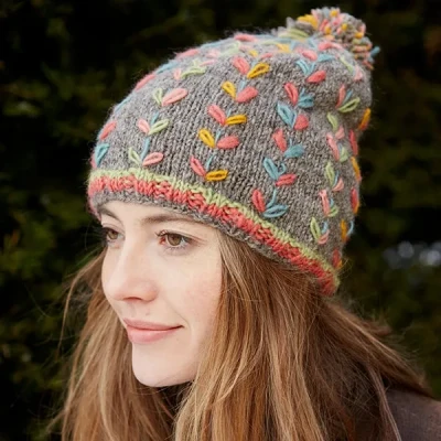 This Pachamama Kylemore Bobble Beanie in Grey, is beautifully embroidered with simple leaf patterns inspired by nature.This beanie hat is hand embroidered, fleece lined and hand knitted.Made from 100% Wool.Machine wool wash max 30 degrees or cool handwash.PLEASE NOTE colours and patterns may vary slightly due to their hand made nature.