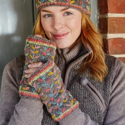Fend off the cold and keep your hands warm with these Pachamama Kylemore Handwarmers in Grey, they are beautifully hand embroidered with a simple trailing leaf pattern inspired by nature.With a thick hand knitted outer layer and a soft fleece lining, these fingerless gloves have been crafted with care for added comfort and warmth.Matching accessories available.100% Wool, 100% Polyester Fleece Lining.Machine wool wash or cool handwash.PLEASE NOTE colours and patterns may vary slightly due to their hand made nature.