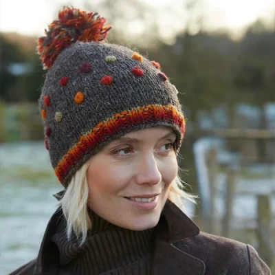 The Pachamama Montpellier Bobble Beanie hat in Bark has been hand knitted from a wool blend and for added comfort, features Sherpa fleece lining around the forehead. Designed with a multi-coloured bobble and a small pom pom pattern in an array of reds and oranges against a grey-brown hue.Perfect for keeping you warm and cosy during the colder months.Matching accessories available.100% Wool and 100% Polyester Sherpa Fleece Lining.Machine wool wash or cool handwash.