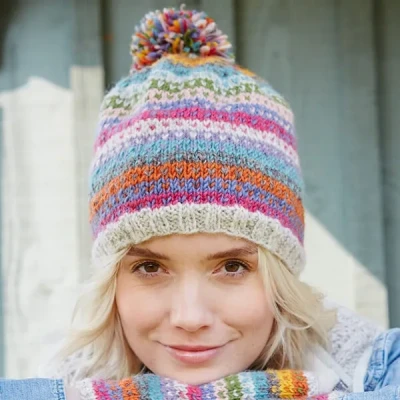 The Pachamama Villarica Bobble Beanie hat has been hand knitted from a wool blend and for added comfort, features Sherpa fleece lining around the forehead. Designed with a large multi-coloured bobble and a decorative pattern of heart dotted stripes in a rainbow of gorgeous colours.Perfect for keeping you warm and cosy during the colder months.Matching accessories available.100% Wool and 100% Polyester Sherpa Fleece Lining.Machine wool wash or cool handwash.PLEASE NOTE colours and patterns may vary slightly due to their hand made nature.