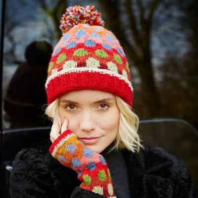 Pachamama Women Wool Beanie Bobble Hat Fleece Lined Handknitted Bright Spots Red One Size Handmade Extra Warm Fair Trade